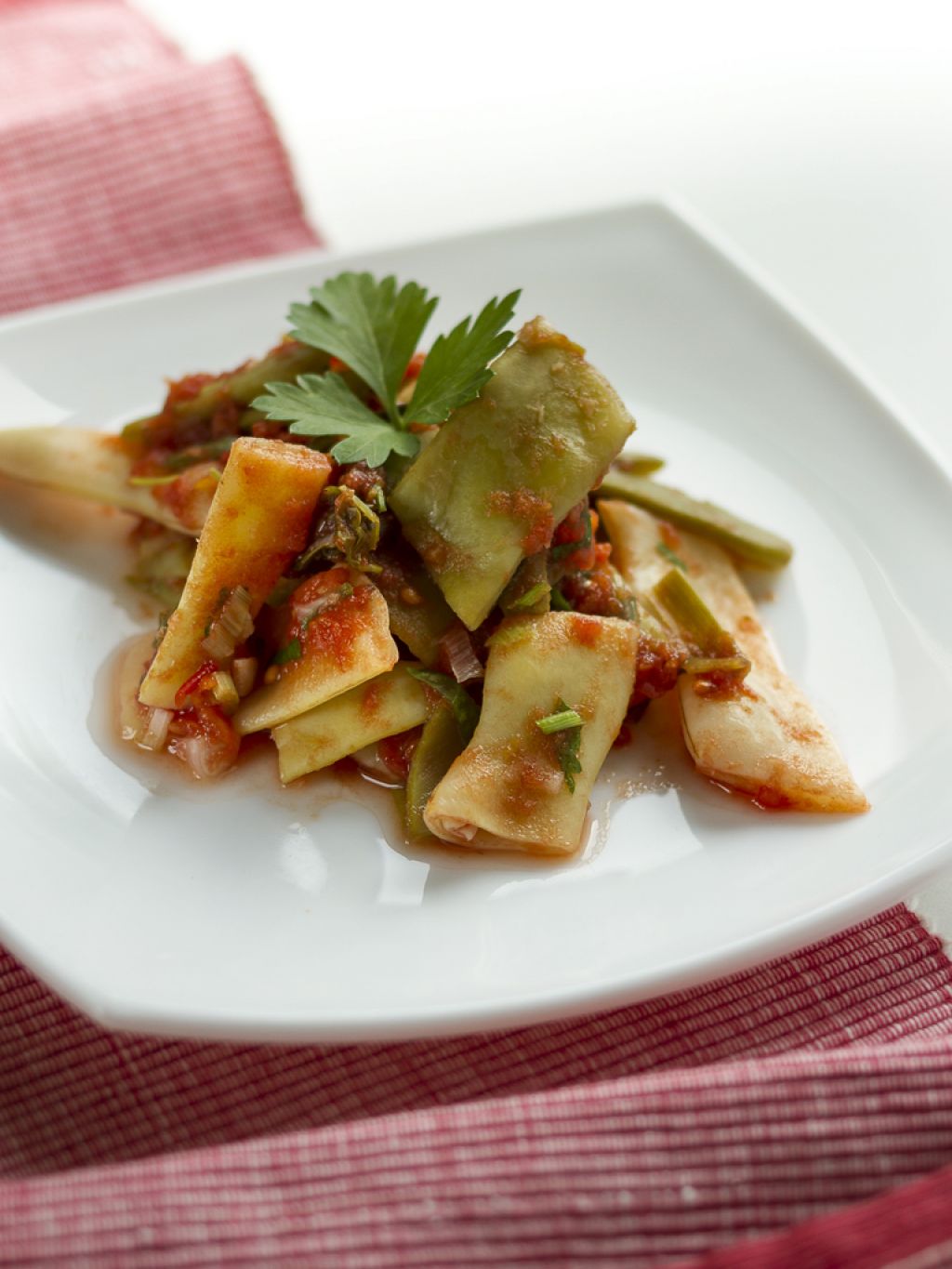 Nazadnje vmešamo kuhan stročji fižol, po potrebi prilijemo malo vode, v kateri se je kuhal, in jed začinimo s preostankom česna ter s peteršiljem.