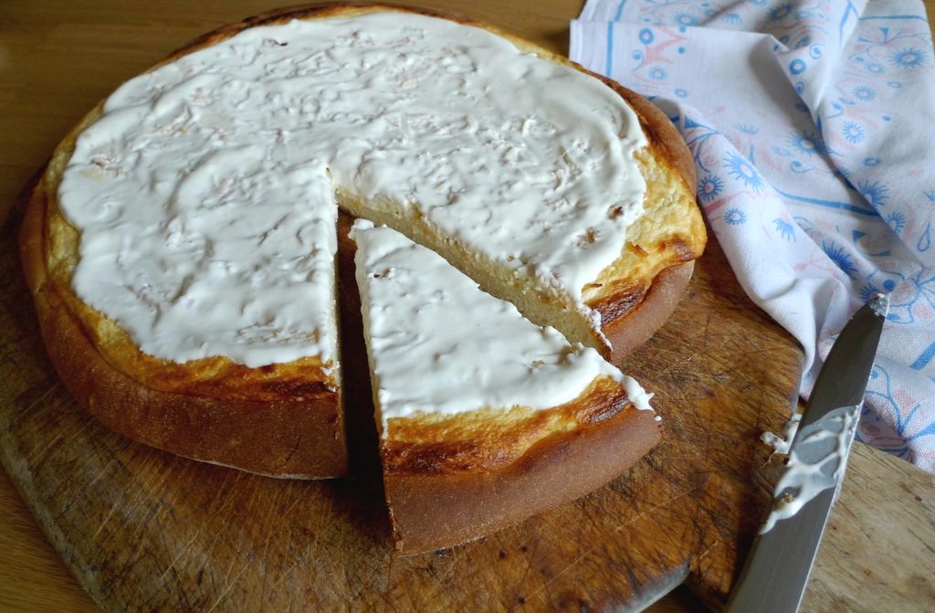 Pečeno pogačo premažemo še z razmešano kislo smetano.
