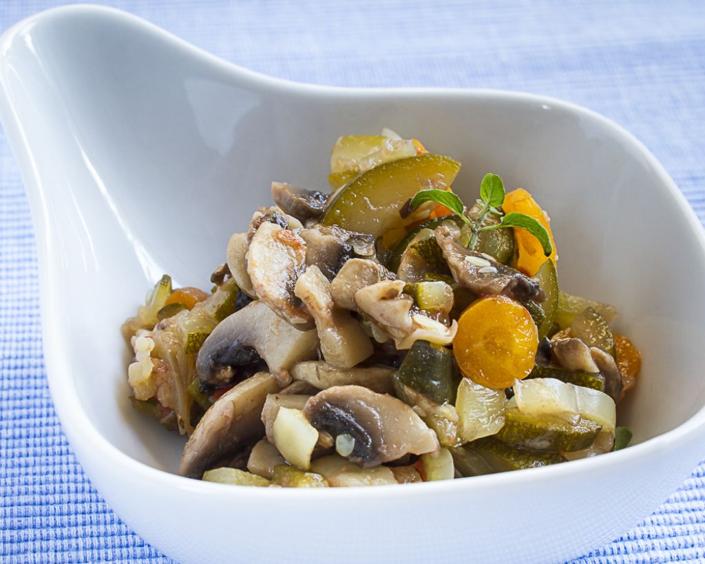 Vso zelenjavo in šampinjone narežemo na manjše kose in stresemo v kozico.