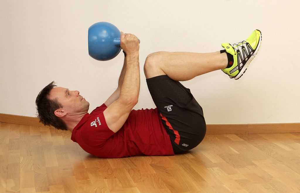 Pravzaprav bi našo novo vajo moral poimenovati priteg čez glavo s kettlebellom in kratkim upogibom trupa z dvignjenimi nogami. Precej dolgo ime za vajo, zato naj ostane malce krajše. Slovenska terminologija je še v povojih, a ne zato, ker ne bi zmogli lepih slovenskih imen, ampak zato ker se odgovorni za terminologijo ne morejo usesti skupaj in reči, kako bomo poimenovali posamezne vaje. Je bolje kakor pred 20 leti, vseeno pa ne tako kot na primer angleška ali ameriška imena za posamezne vaje, pri katerih takoj veš, o čem avtor piše. Terminologije danes ne bomo »rešili«, ker je namen mojih člankov povsem drugačen, saj vam želim opisovati vaje, pri katerih se v gibanje vključuje več različnih mišic, pri tem pa delujejo funkcionalno na telo. Poleg tega želim občasno opozoriti in napisati malo širši pogled na trening, saj je trening predvsem kompleksen in kreativen proces športnika oziroma njegovega trenerja. Ko gledam delo marsikaterega trenerja, lahko rečem dobro, odlično ali pa tudi precej pomanjkljivo in v določenih primerih popolnoma zgrešeno. Se pa v zadnjih letih stanje precej izboljšuje in na trgu je veliko odličnih, vrhunskih trenerjev, ki jim lahko zaupate svoje telo in zdravje.