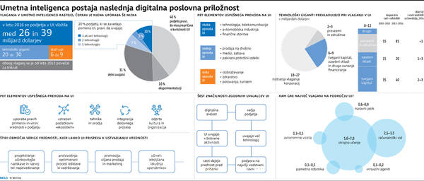 Vodilni na tem področju so digitalni velikani, kakršna sta Google in Baidu, tehnološka podjetja naj bi v razvoj rešitev z umetno inteligenco leta 2016 vložila od 20 do 30 milijard dolarjev − 90 odstotkov z lastnimi vlaganji, deset pa s prevzemi manjših podjetij, ki so dejavna na področju UI. Podobno hitro rastejo vlaganja skladov tveganega kapitala ali zasebnih vlagateljev. So sicer precej manjša (od šest do devet milijard dolarjev leta 2016, ocenjuje McKinsey), vendar pa trikrat višja kot leta 2013.