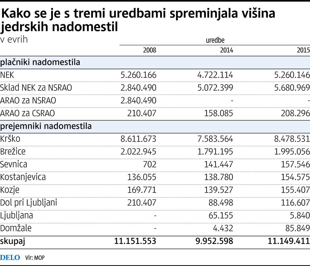 Celotno jedrsko nadomestilo (98 odstotkov prejmejo posavske občine, ostalo ljubljanske zaradi skladišča Brinje in reaktorja Triga) v grobem plačujeta dva državna subjekta: za odlagališče sklad za razgradnjo NEK, za omejitve, vezane na obratovanje krške nuklearke, pa NEK sama.