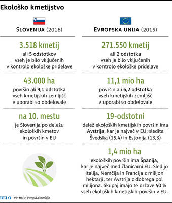»Slovenija vse od vstopa v EU izdatno podpira ekološko kmetovanje. V okviru programa razvoja podeželja 2014–2020 je zanj namenjenih 65 milijonov evrov,« pravijo na kmetijskem ministrstvu. Anamarija Slabe z Inštituta za trajnostni razvoj pa meni, da to ne zadošča za hitrejši razmah ekološkega kmetijstva.