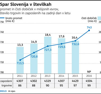 Spar je lani ustvaril 743 milijonov evrov bruto prometa. Ali je sorazmerno z njim zrasel tudi dobiček, nam prvi mož Spara ni razkril. Dobiček je zanj še vedno tabu tema. Številke najdemo šele kasneje, v poslovnem poročilu. Za orientacijo: leta 2015 je bilo dobička 16,4 milijona evrov. Uradnih meritev razreza trga v Sloveniji ne dela nihče, vsak trgovec zase pa ve, kolikšen je njegov tržni delež. Sparov je po Merviču 22- do 23-odstoten.