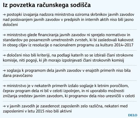 Poročilo, ki ga je podpisal generalni državni revizor Tomaž Vesel, je zajelo obdobje med 1. januarjem in 31. decembrom 2015, torej leto, ko je ministrstvo za kulturo (MK) vodila ministrica Julijana Bizjak Mlakar. In za to revidirano obdobje računsko sodišče (RS) meni, da ministrstvo ni imelo vzpostavljenega učinkovitega nadzora nad poslovanjem javnih zavodov na področju kulture, katerih ustanoviteljica je Republika Slovenija.