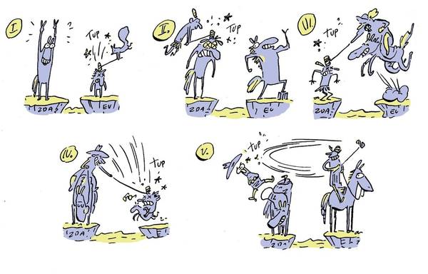 Krog medcelinskih ironij je tako sklenjen. Konjički so iz gozda pokukali v obljubljeni deželi in na širokih stepah zrasli do sodobnih kolosov. Ljudje so jih zatekli pozno, a kot dobri lovci, in konji so jim podlegli − a ne preden so v Evropo izvozili svoj zadnji, najmočnejši model: ta je pozneje prišel prav ravno dotlej manj sposobnim homotom, čim so se ti okrenili h kulturi.