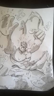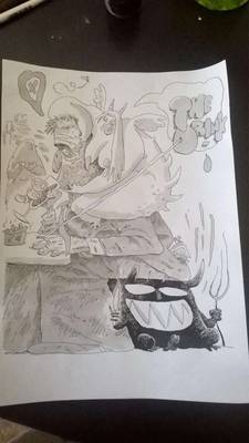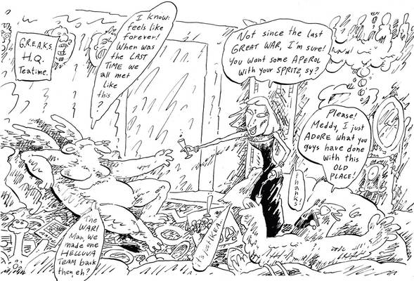 Zrisal sem tudi kratek šeststranski strip, ki pa še čaka na barve, zato vam tule pokažem le par sličic, recimo tole, kjer sirena, sfinga in meduza popivajo na olimpu, obujajoč spomin na stare čase: