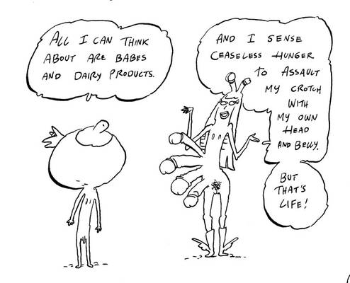 To me je pri stripu vedno najbolj dražilo: risati asociativno, brez načrta in agende, a se nato ne zadovoljiti z eno samo podobo, ampak se kar spraševati, kaj se bo z liki zgodilo v naslednjem trenutku, in še naslednjem, in še ... in tako do bridkega konca.