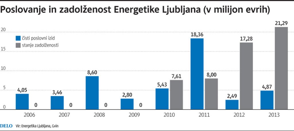 Poročali smo, da je Energetika Ljubljana najbolj zadolženo izmed podjetij, ki so povezana v Javni holding Ljubljana. Čeprav vsa leta posluje z visokimi, večmilijonskimi dobički in do leta 2010 ni imela niti evra dolga, se je to pred štirimi leti začelo spreminjati z lastniškim povezovanjem s Termoelektrarno Toplarno Ljubljana (Te-Tol). Leta 2010 je imela Energetika 7,6 milijona evrov bančnih posojil, leto kasneje dobrih osem milijonov, leta 2012 že 17,3 milijona, lani pa še štiri milijone več. Prihodki družbe so do leta 2011 rastli (leta 2006 jih je bilo 83 milijonov, dve leti kasneje 101 milijon, 2011. pa skoraj 133 milijonov), v zadnjih dveh letih pa so padli – leta 2012 na 121, lani pa na manj kot 114 milijonov.