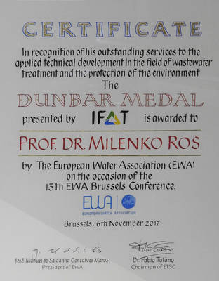 Na konferenci Evropskega združenja za vodo (EWA) v Bruslju je doktor kemijskih znanosti Milenko Roš za svoje zasluge kot prvi Slovenec do zdaj prejel posebno priznanje – medaljo Williama Dunbarja. Roš je bil od leta 1971 zaposlen na Kemijskem inštitutu v laboratoriju za kemijo, biologijo in tehnologijo voda ter ga vodil več kot 25 let, vse do svoje upokojitve leta 2009. Soustanovil je tudi Slovensko društvo za zaščito voda (SDZV), bil je predsednik društva in član upravnega odbora Mednarodnega združenja za vodo (IWA) od leta 1995 do 2011 ter bil tudi pobudnik, da je SDZV postal član EWA. Roš je še vedno dejaven, rad se ukvarja s športom. Če bi lahko začel kariero znova, bi proučeval živo vodo.