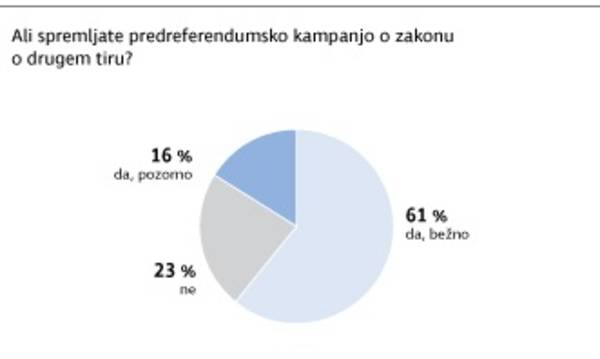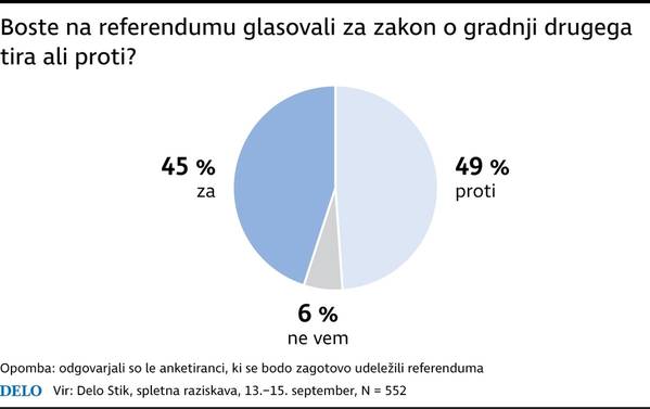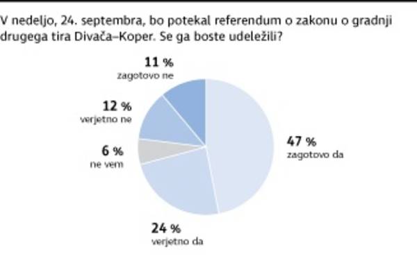 Bistven podatek pri tem vprašanju je, da med tistimi, ki so odgovorili, da se bodo zagotovo udeležili referenduma, prevladujejo podporniki SDS, NSi in starejši anketiranci. Pri naslednjem vprašanju smo namreč upoštevali le tiste, ki so odgovorili, da se bodo zagotovo udeležili referenduma. Med 47 odstotki, ki so izrazili visoko gotovost udeležbe, je bilo nekaj več nasprotnikov zakona o drugem tiru kot podpornikov. Ob podatku, da so podporniki SDS in NSi bolj odločeni, da bodo glasovali, in ob realnejšem podatku o udeležbi (denimo okoli 30-odsotna) je veliko verjetnejši scenarij, da bo zakon o drugem tiru prepričljivo zavrnjen. Seveda če bo nasprotovalo zakonu vsaj 20 odstotkov volilnega telesa.