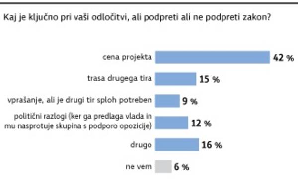 Zanimalo nas je tudi, kaj je za anketirance ključno pri odločitvi, ali podpreti ali ne podpreti zakon. Velika večina (42 odstotkov) je pripisala največji pomen ceni projekta. Sledi trasa drugega tira, politične razloge za odločitev je navedlo 12 odstotkov vprašanih, vprašanje, ali je drugi tir potreben, pa se je zdelo pomembno slabi desetini sodelujočih v anketi.
