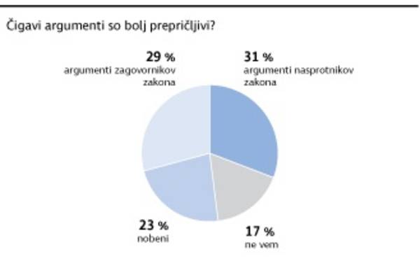 Zanimalo nas je tudi, čigavi argumenti so bili po mnenju anketirancev prepričljivejši – argumenti vlade in podpornikov zakona ali argumenti nasprotnikov zakona. Nekoliko več anketirancev meni, da so argumenti nasprotnikov zakona prepričljivejši (31 odstotkov), 29 odstotkov vprašanih je prepričanih, da so argumenti vlade prepričljivejši, 23 odstotkov anketiranih pa meni, da argumenti enih ali drugih niso prepričljivi.