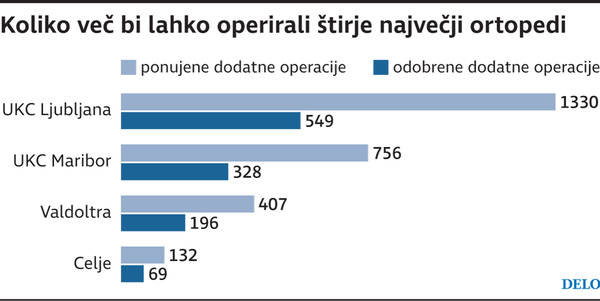 Za vseh 13 ortopedskih izvajalcev podatkov nimamo, a pri štirih največjih vidimo, da so ponudili v izvedbo več kot dvakrat več operacij, kot so jim jih odobrili (v tabeli). Čeprav njihove zmogljivosti še zdaleč niso porabljene, je vlada v sredo potrdila še 14. izvajalca, zasebno podjetje MD Medicina, in tako dodatno razdrobila dejavnost.