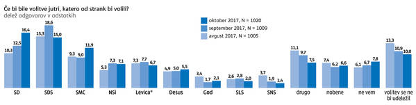 Največja opozicijska stranka SDS je vrh barometra zavzela pred dvema letoma, oktobra leta 2015, in vse od takrat tam tudi ostala. Po 24 mesecih je prestol zdaj prevzela SD s 16,4 odstotka podpore oziroma dobrimi štirimi odstotki boljšim rezultatom kot pred mesecem dni. Za približno toliko je nižja podpora SDS, ki se je s 15 odstotki vrnila na raven enoletnega povprečja. Rezultat podpore je bil septembra tako očitno anomalija, ne trend. Ali skok SD navzgor pomeni trend rasti podpore stranki, bo jasno šele v prihodnjih mesecih.