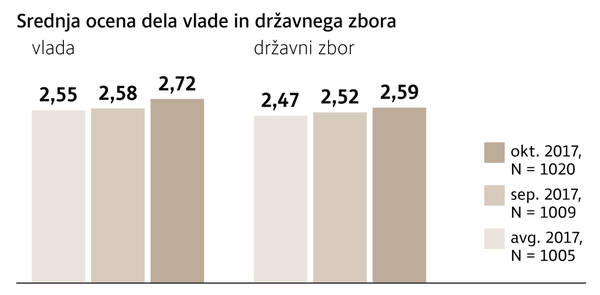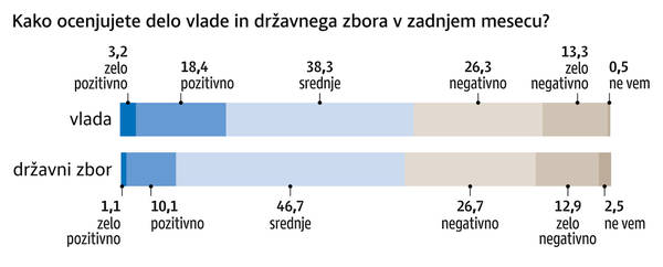 Po drugi strani je vlada dobila eno višjih ocen v zadnjem letu, saj jo prvič letos pozitivno ocenjuje več kot petina anketiranih, odstotek negativnih ocen pa je prvič padel pod 40 odstotkov anketiranih.