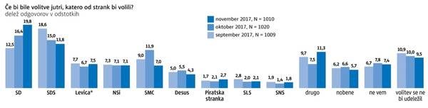 Na drugem mestu je SDS. Ker je stranka v tem položaju že drugi mesec zapovrstjo, lahko sklepamo, da smo morda že priča trendu, da je največja opozicijska stranka v ključnem obdobju pred parlamentarnimi volitvami (verjetno junija prihodnje leto) začela izgubljati tla pred konkurentko na drugi strani političnega pola. Na tretjem, četrtem in petem mestu so se zvrstile stranke Levica, NSi in SMC - vse okoli sedemodstotne podpore, zato je težko oceniti, kateri kaže bolje. Levica in NSi imata v zadnjem obdobju stabilno podporo na tej ravni, stranki SMC pa precej niha navzgor in navzdol. Približno četrtina volilnega telesa ni opredeljena.