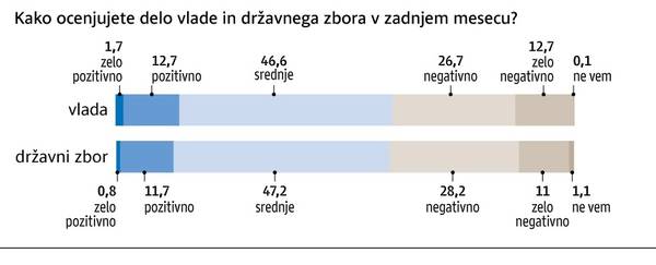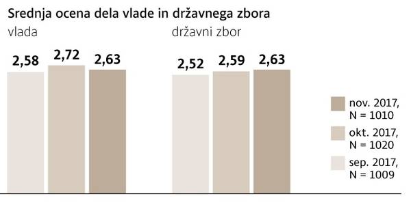 Novembra je slovenska javnost vladi podelila nekoliko nižjo srednjo oceno. Sprememba se je zgodila, ker so sodelujoči v anketi tokrat vladi podelili malo manj pozitivnih ocen in toliko več srednjih ocen, negativnih pa je bilo toliko kot pred mesecem dni.