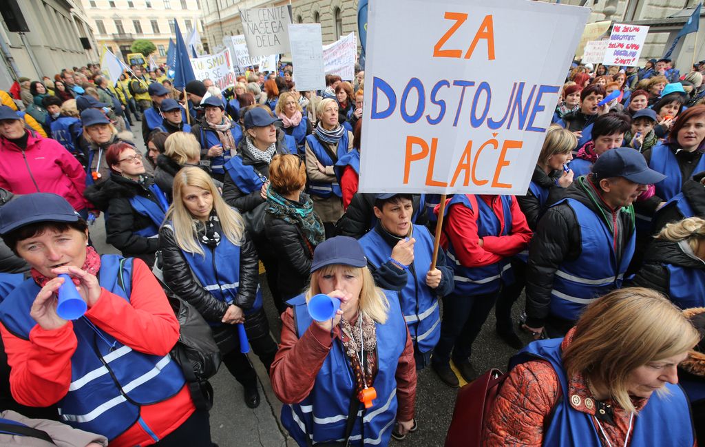 »Vsaj zaposleni na najslabše plačanih delovnih mestih se držijo obljub – vrnili se bodo pred vlado, da jo spomnijo na njena neuresničena zagotovila,« so napovedali pri Sindikatu vzgoje, izobraževanja, znanosti in kulture Slovenije (SVIZ) pred torkovim shodom. Zaposleni v skupini J in pomočnice vzgojiteljic so že jeseni opozorili na to, kako neustrezno so vrednotena njihova delovna mesta. Vlada in sindikati javnega sektorja so se potem v decembra podpisanem sporazumu, med drugem dogovorili tudi za to, da bo letos v proračunu namenjenih 70 milijonov evrov za odpravo anomalij v plačnem sistemu.