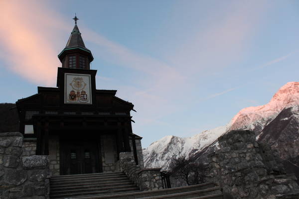 Obzidje in spodnji del zgradbe sta sicer kamnita, zgornji, večji del konstrukcije pa je iz macesnovega lesa. V notranjosti na hrastovih ploščah, ki simbolizirajo liste spominske knjige, po sistemu vojaške hierarhije najdemo vžganih 2564 imen na okoliških bojiščih padlih avstro-ogrskih vojakov, pokopanih na Ločah pri Tolminu. Leseno svetišče je tudi ena izmed postaj na zgodovinski poti, imenovani Pot miru, ki povezuje spomenike in ostaline prve svetovne vojne v Zgornjem Posočju. Leseno svetišče je novembra lani praznovalo stoto obletnico zgraditve.