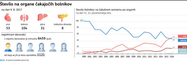 Po podatkih zavoda so bolniki 9. avgusta 2017 čakali na skupaj 232 organov – nekateri so čakali na več organov hkrati. Na primer, od 140 bolnikov, ki so čakali na presaditev ledvice, jih je sedem čakalo še na trebušno slinavko, en bolnik pa na jetra.
