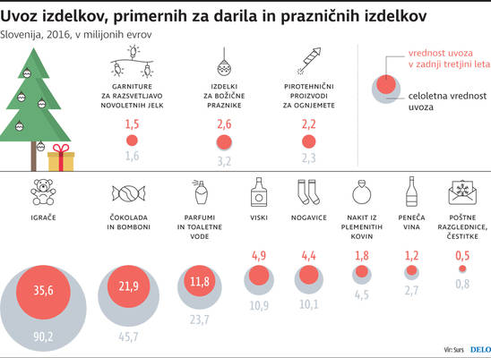 Konec leta kupujemo tudi veliko igrač in drugih predmetov, primernih za darila, predvsem pa izdelke za ustvarjanje prazničnega razpoloženja, o čemer pričajo podatki o uvozu v zadnjih treh mesecih. Takrat uvozimo za tretjino vseh igrač, ki pridejo iz tujine, skoraj polovico vse uvožene čokolade, prav tako polovico parfumov in toaletnih vod, viskija, nogavic, nakita in penečih vin.