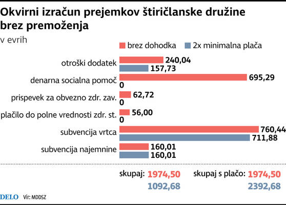 Družina, kjer sta oba starša brez dohodka, dobi 935 evrov otroških dodatkov in denarne socialne pomoči, prispevki za obvezno zdravstveno zavarovanje, plačilo do polne vrednosti zdravstvenih storitev, subvencija vrtca za dva otroka in subvencija najemnine pa znesejo še 1039 evrov. Družina, kjer imata oba starša minimalno plačo, pa dobi 157 evrov otroških dodatkov, subvenciji vrtca in najemnine pa sta 871 evrov.