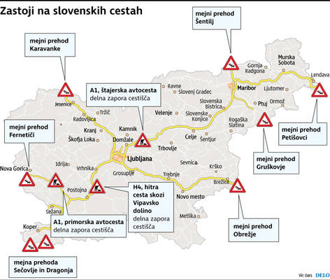 Zastoji so predvsem na koncu podravske avtoceste v smeri Gruškovja, na zahodni ljubljanski obvoznici, mimo Brda proti Brezovici in Vrhniki, med tednom pa je zgoščen in upočasnjem promet na primorski avtocesti. Večurni zastoji so poleti tudi pred predorom Karavanke, v obe smeri, iz Avstrije proti Sloveniji in obratno, podobno je na cestah v slovenski Istri.