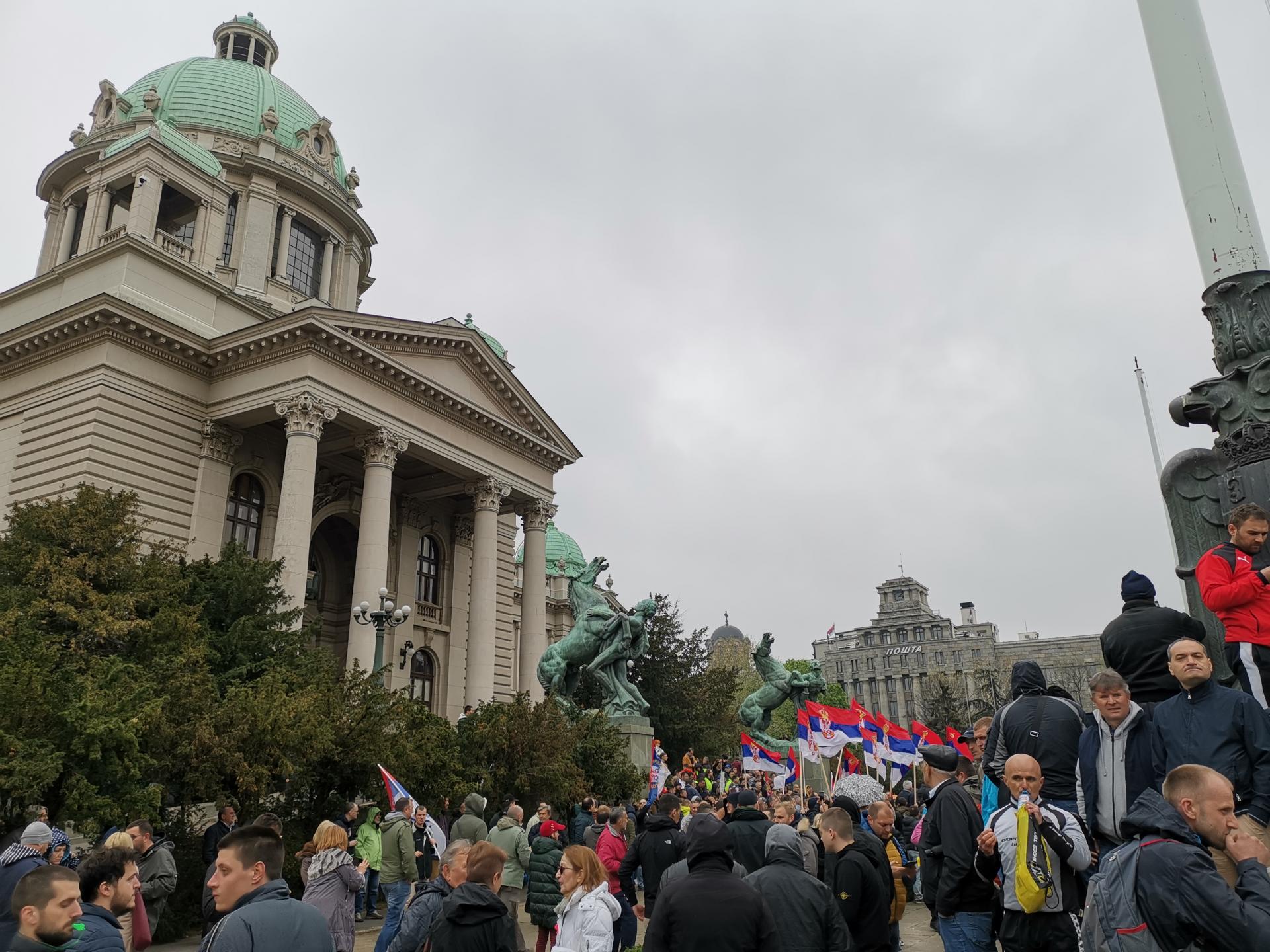 Medtem ko tekači z vsega sveta tekajo po beograjskih ulicah, se pred skupščino zbirajo protestniki. Opozicija, ki proteste organizira, ni hotela izdati programa današnjih protestov, povedala pa je, da ne bodo vdirali v institucije. Pred nekaj tedni so namreč protestniki nasilno šli v zgradbo nacionalne televizije, kar je potem povzročilo, da so posegli policisti.