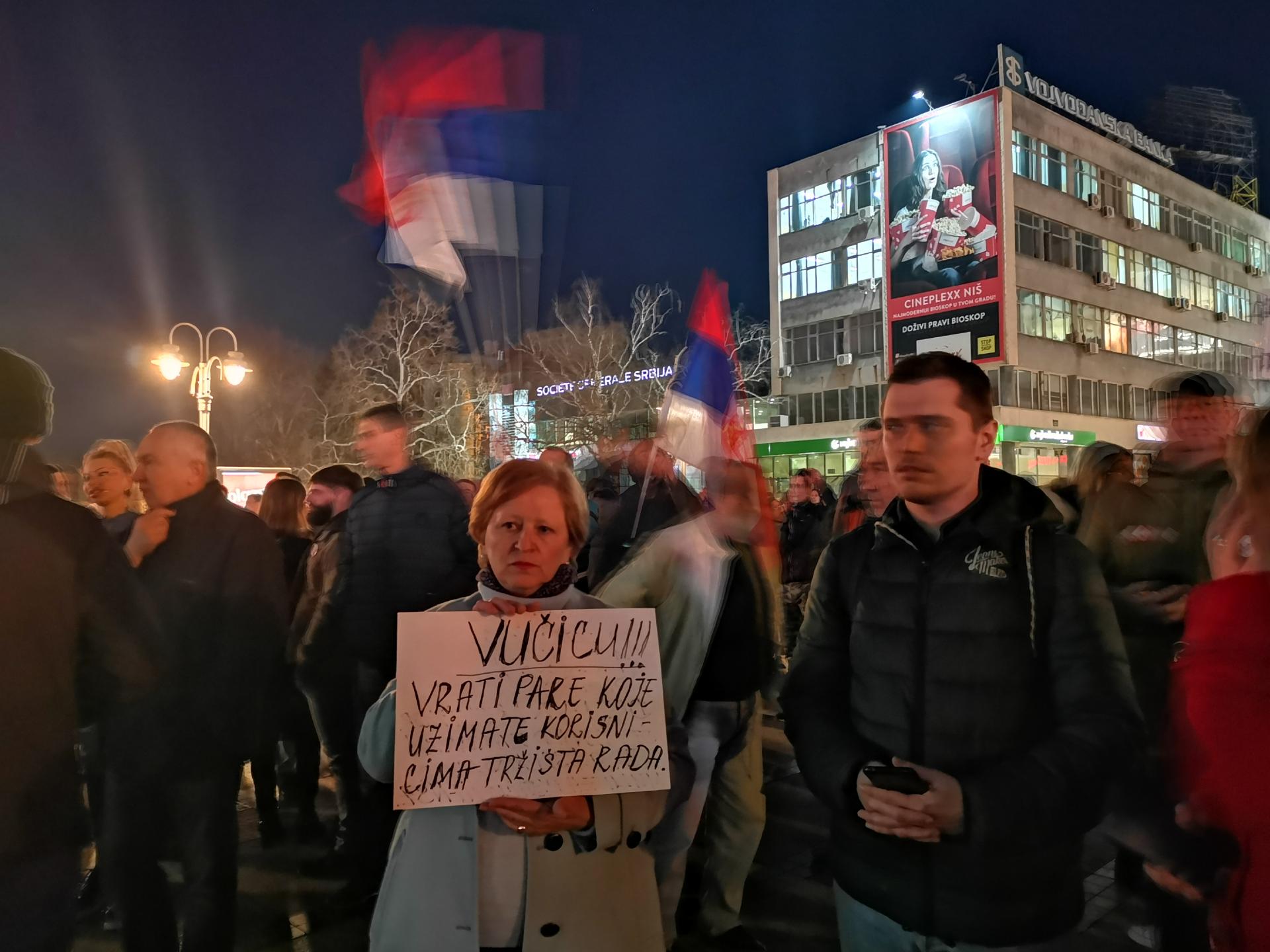 V Nišu, tretjem največjem mestu v Srbiji s 185.000 prebivalci, so protesti drugačni kot v Beogradu. Potekajo pod geslom »Niš brez strahu«. Udeležilo se jih je manj kot tisoč ljudi, predvsem moških, ki gneva niso izrazili na glas, niso skandirali kot v Beogradu, pač pa so občasno v znak nezadovoljstva ali podpore temu, kar slišijo, žvižgali s piščalkami. Zdi se, da je Nišlije, kot imenujejo sami sebe, zajela apatija. V južni Srbiji živijo ljudje precej slabše kot v Beogradu in Vojvodini. Plače so nizke, velika je brezposelnost. Dejan Milošević, eden izmed govorcev na protestu, je navedel osupljiv podatek: v južni Srbiji je vsako peto gospodinjstvo brez elektrike. Nimajo luči, ker niso plačali računa za elektriko. Računa niso plačali, ker nimajo s čim, je povedal. Družinska pokojnina po možu je 13.000 dinarjev, mi je povedala gospa, ki je stala ob meni. To je približno 120 evrov. Ni čudno, da ljudje protestirajo.