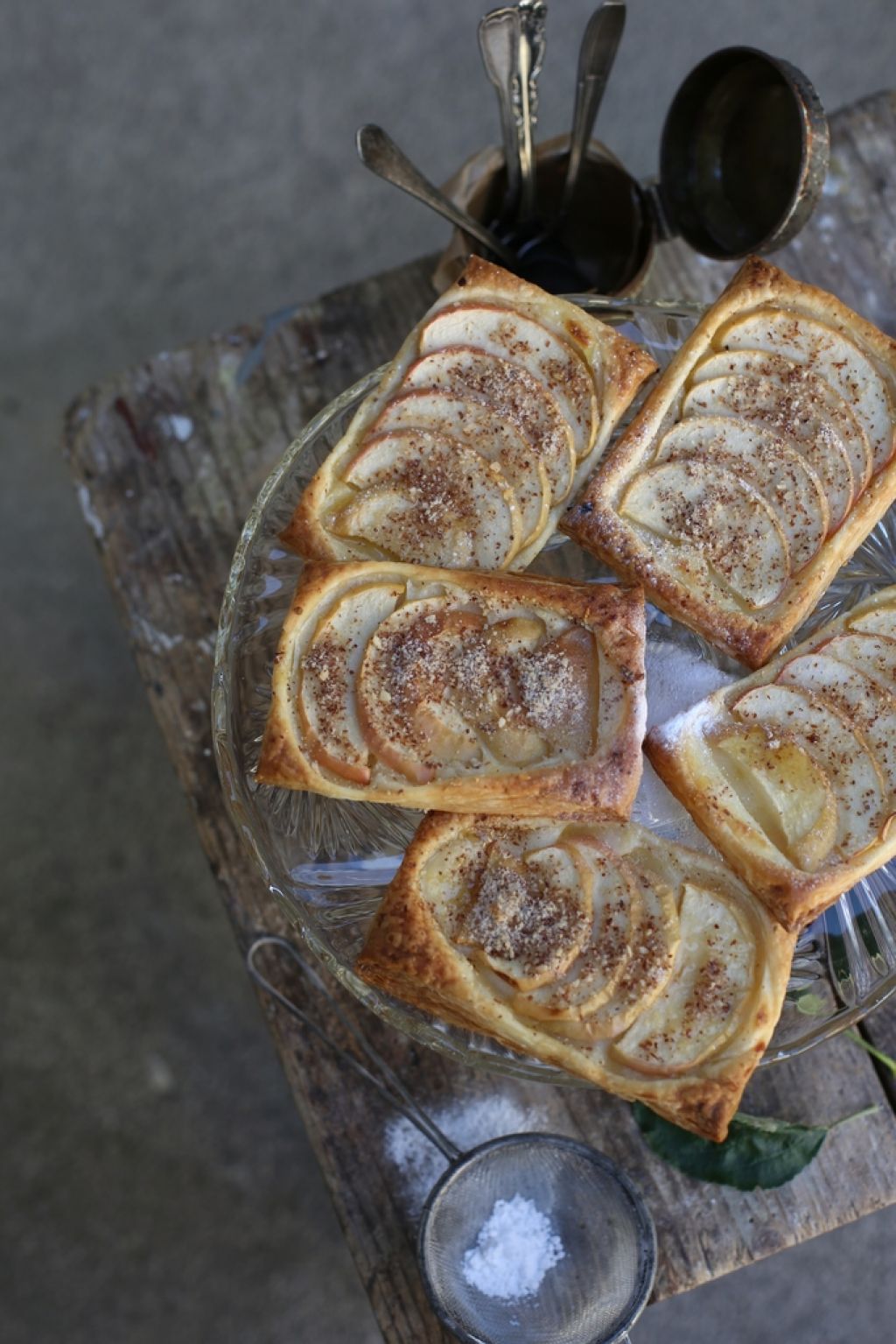 Odvijemo listnato testo in ga razrežemo na 8 enakih delov. Na vsak del damo žličko kisle smetane in malce razmažemo (ne čisto do roba). Čez razporedimo tanke rezine jabolka in posujemo z mletimi mandlji, cimetom in navadnim sladkorjem.