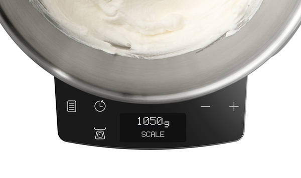 To je prvi kuhinjski aparat, ki ima vgrajeno tehtnico. Sestavine lahko enostavno stehtate neposredno v posodi, na samem aparatu ali v dodatnem priboru (na primer: vrču). Ker ne potrebujete dodatne tehtnice, prihranite tako pri času priprave kot tudi prostoru.