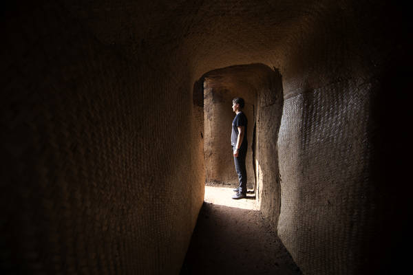 Aleš Šteger v notranjosti Piramide pregnanih pesnikov, po pisanju Huffington Posta ene najbolj odmevnih instalacij na bienalu v indijskem Kočiju - Kochi Muziris Biennale (KMB) Foto: Arhiv/Kochi Muziris Biennale (KMB)