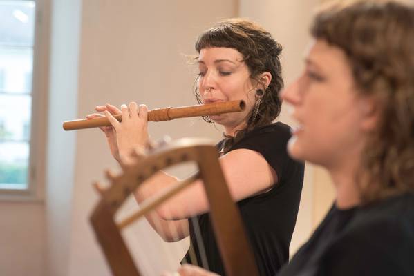 M. W.: Brskala sem po srednjeveških arheoloških virih in odkrila podobe na oklepih, ki prikazujejo ljudi, ki igrajo na inštrumente, med drugim take, narejene iz živalskih kosti. Pri enem od izdelovalcev skandinavskih tradicionalnih inštrumentov sem naročila izdelavo alikvotne flavte, pri drugem pa flavto iz jelenove kosti. Poleg teh dveh sem vključila preprosti prečni flavti, kakršne so v srednjem veku uporabljali po Skandinaviji in verjetno drugod po Evropi. Inštrumente sem izbrala zaradi njihove zvočne kvalitete, hkrati sem bila pozorna na njihovo kompatibilnost s Hanninim glasom in harfo. Flavta iz jelenove kosti ima posebno tonaliteto, ne igra običajne intonacije in ima samosvojo uglasitev. Ker sva s Hanno ugotovili, da je ne moreva uporabiti skupaj s harfo, sva jo v določenem delu izvedbe povezali le s Hanninim glasom. Domnevam, da tudi v srednjem veku flavte iz jelenove kosti in harfe niso uporabljali skupaj. S Hanno namreč vselej izhajava iz opazovanja in poslušanja, nikoli se ne lotiva stvari na silo, ampak se odločiva tako, da preizkusiva inštrumente v povezavi z glasom.