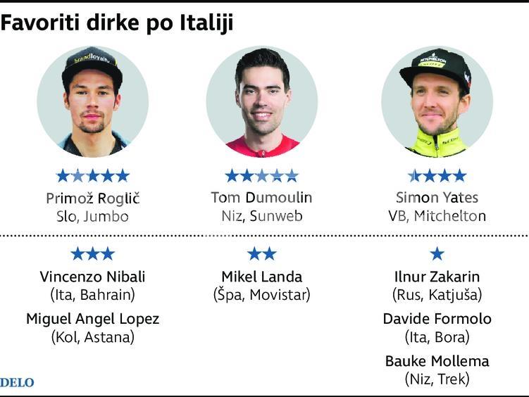 Na letošnjem Giru bo lahko zmagal le raznovrsten kolesar, ki se dobro znajde tako v boju s štoparico kot v najtežjih gorskih etapah. Nič čudnega tako ni, da je Tom Dumoulin ob Rogliču prvi favorit za rožnato majico. Nizozemec je leta 2017 že stopil na najvišjo stopničko, lani je dirko končal tik za Chrisom Froomom, poleti je tudi Tour končal na 2. mestu.