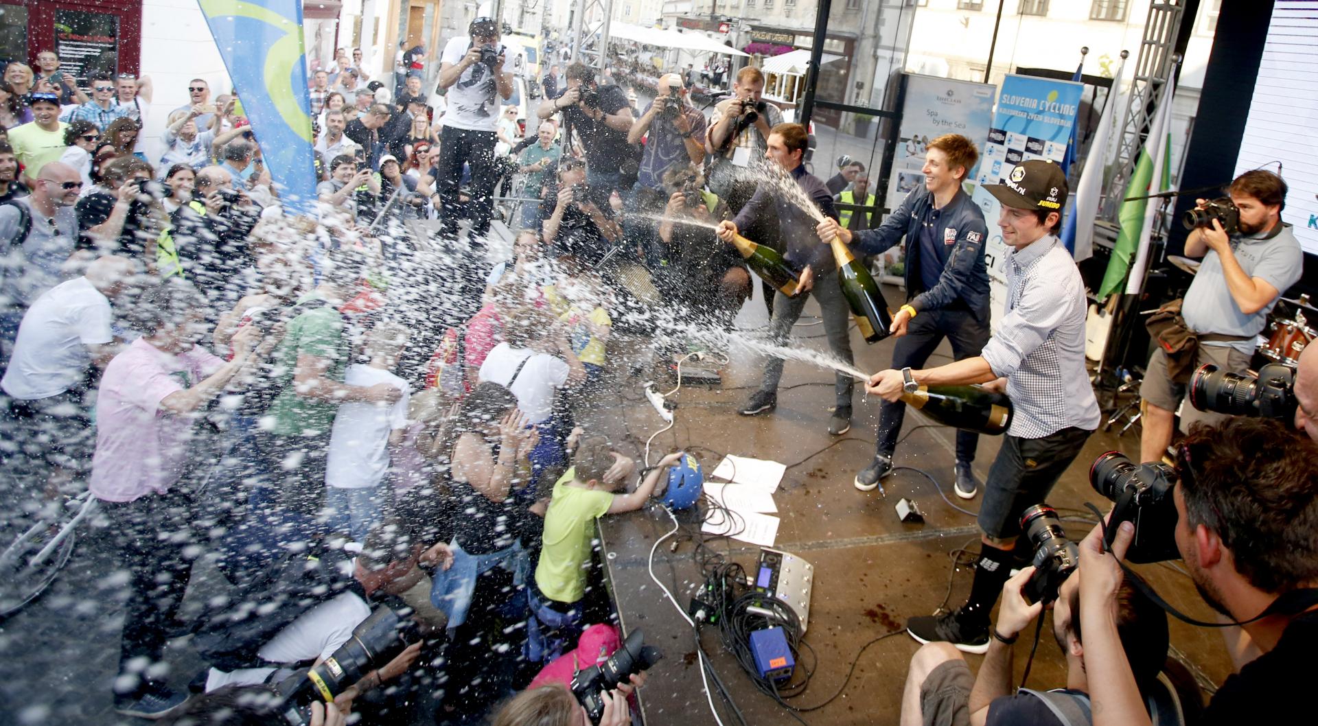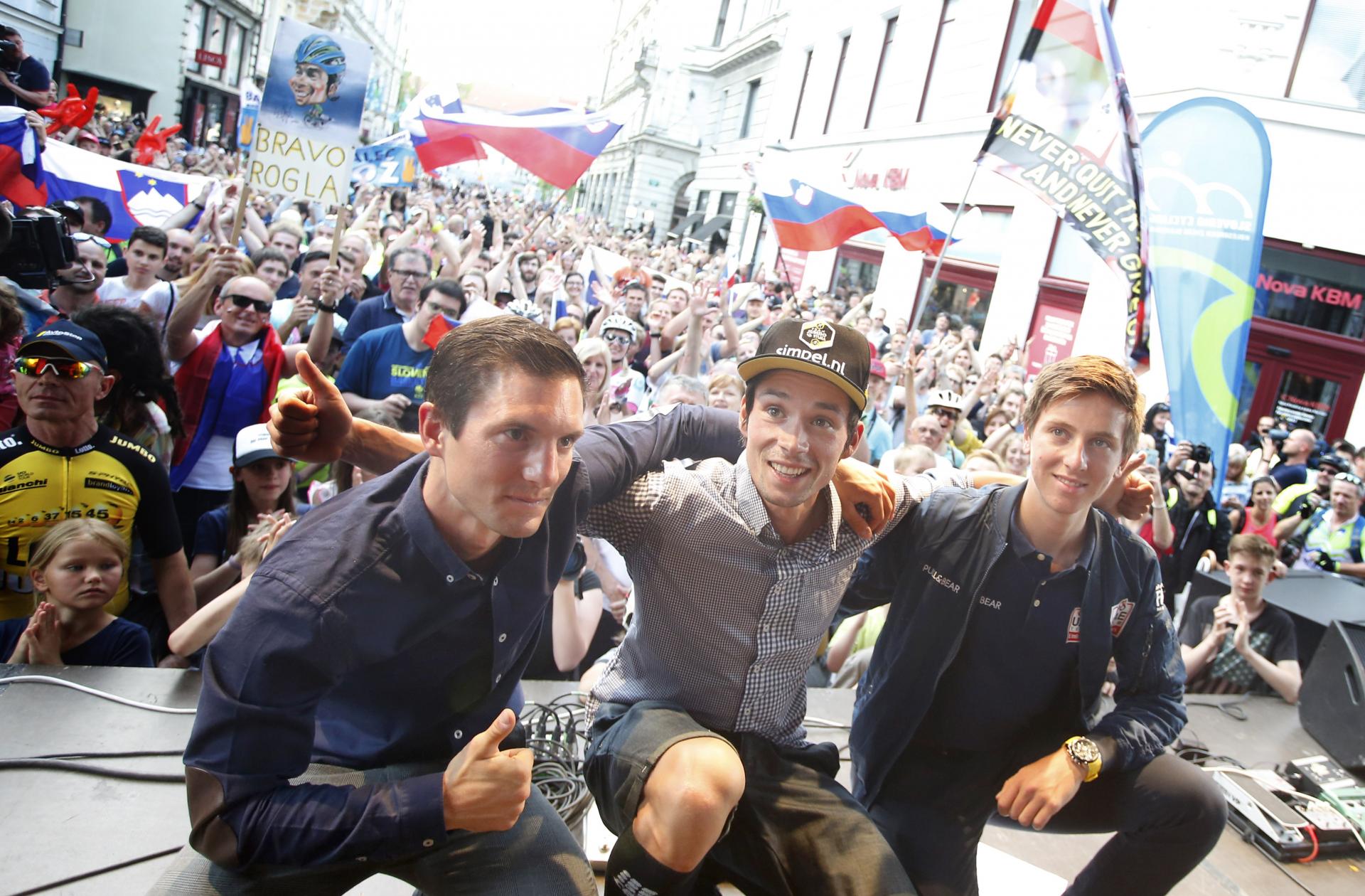 Roglič je stopil pred navijače – veliko jih je v središče Ljubljane prikolesarilo, nekateri morda kar s popoldanske ture, saj so bili v športni opremi – po druženju z mediji v mestni hiši. Zbrani, ki so čakali na sprejem, so se razporedili od odra pred mestno hišo do bližnje slaščičarne. Opremljeni so bili s slovenskimi zastavicami, kot bi bili na dirki. Najprej so pozdravili Tadeja Pogačarja, mladega kolesarskega upa, zmagovalca dirke po Kaliforniji, nato še Jana Polanca, ki je na Giru dva dni nosil rožnato majico, za konec še glavnega junaka Rogliča, ki je zadnji stopil prednje. Zdelo se je, da je nekdanji smučarski skakalec, ki se je, ko je skakalnicam pomahal v slovo, zapisal kolesarstvu, včeraj v Ljubljani združil vse rodove. Najmlajši so ga gledali z občudovanjem, starejši so mu spoštljivo zaploskali.