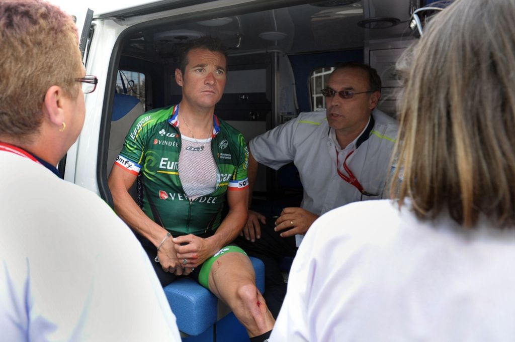 Voeckler si je tako znova zlomil ključnico in še pred štartom končal nastope na dirki. Tako je ogrožen tudi njegov nastop na SP v Španiji.
