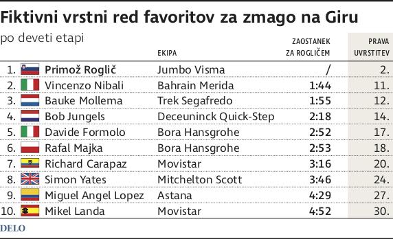 Do prvega vikenda junija bo na Giru zagotovo pestro, Astana bo s Pellom Bilbaom in Lopezom agresivna, Yates se ne bo kar tako predal, tudi Bora z Rafalom Majko in Davidejem Formolom v dobrem položaju bo poizkušala izkoristiti taktično premoč. Medtem ko tekmeci kujejo pravo strategijo, lahko Roglič povsem mirno čaka na nadaljevanje rožnate pentlje, v tem trenutku izgleda skorajda nepremagljiv.