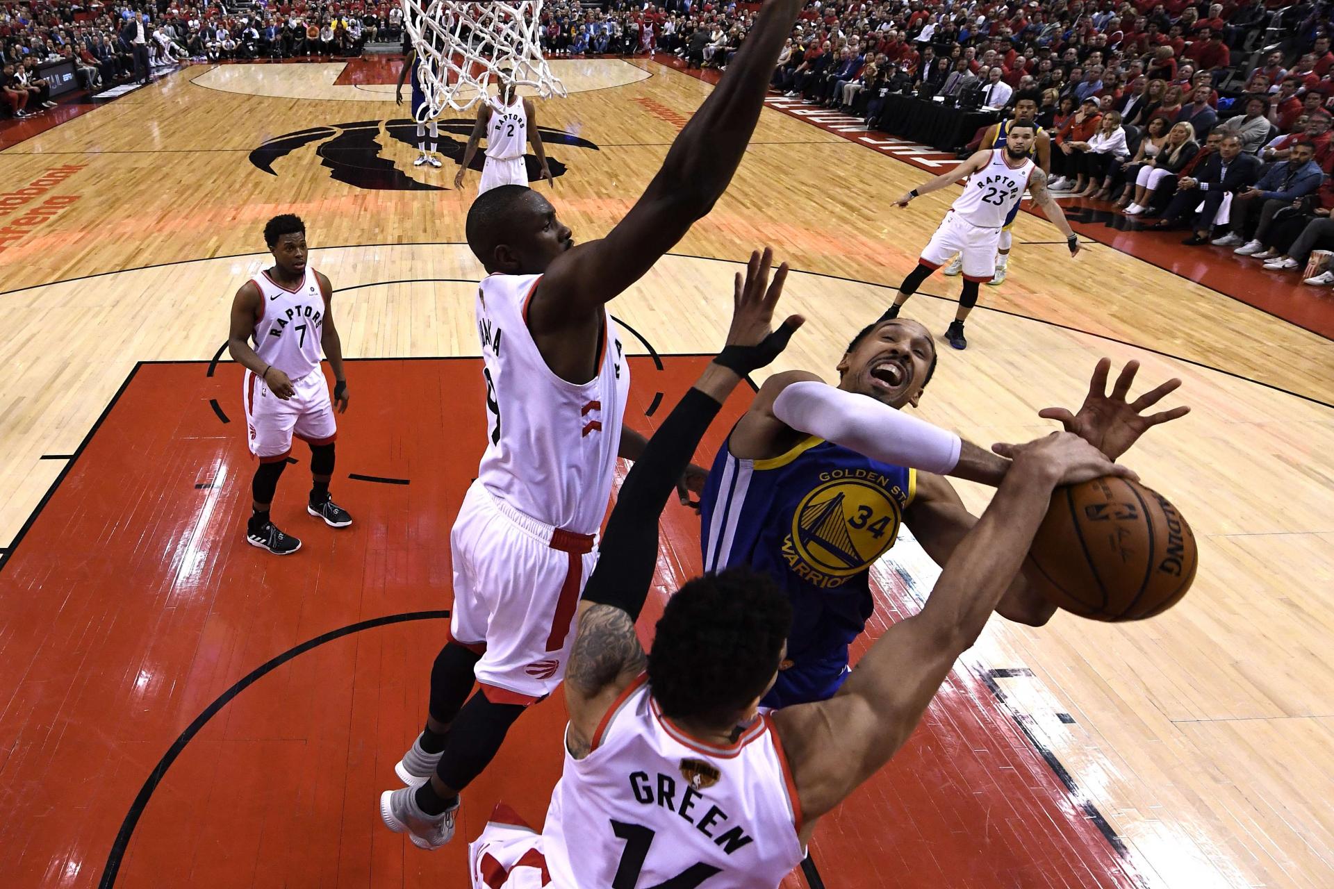 (Leonard 34 – met 8:20 iz igre, trojke 5: za tri, prosti meti 14:14 in 14 skokov, VanVleet 17, Lowry 13, Siakam 12 in 8 skokov, Green 8, Powell in Ibaka (10 skokov) po 7, M. Gasol 6; Thompson 25 – met 10:17, trojke 4:6 , Curry 23 – met 6:17, 3:10, Green 17 – met 6:12, 10 skokov in 9 podaj, Cousins 11 in 10 skokov, Cook 9, Iguodala 8 in 8 skokov, Bogut in Livingston po 6, Jerebko in McKinnie po 2.Met iz igre: 35:94; 38:82.