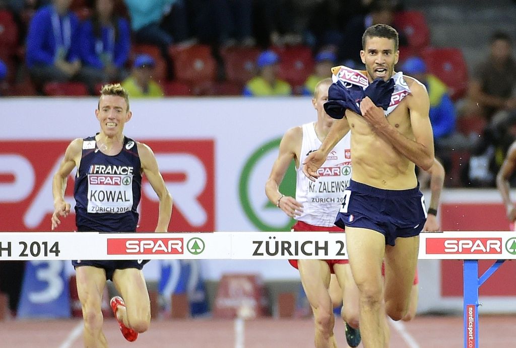 Zürich - Tretji dan evropskega prvenstva v atletiki v Zürichu je veliko prahu dvignila poteza francoskega tekača Mahiedina Mekhissi-Benabbada, ki je bil suvereno in še tretjič zapored na EP najboljši na 3000 m z zaprekami. Svojo zmago je slavil že kakšnih 100 metrov pred ciljem, ko je imel celo čas, da si je slekel dres in brez majice prečkal ciljno črto.