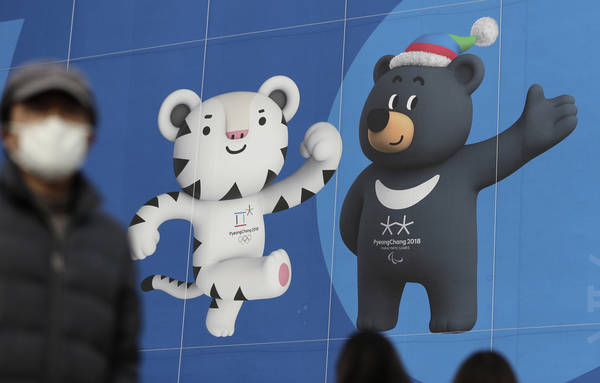 Beli tiger Soohorang in azijski črni medved Bandabi sta maskoti zimskih olimpijskih in paraolimpijskih iger v Južni Koreji. Foto: Lee Jin-man/AP