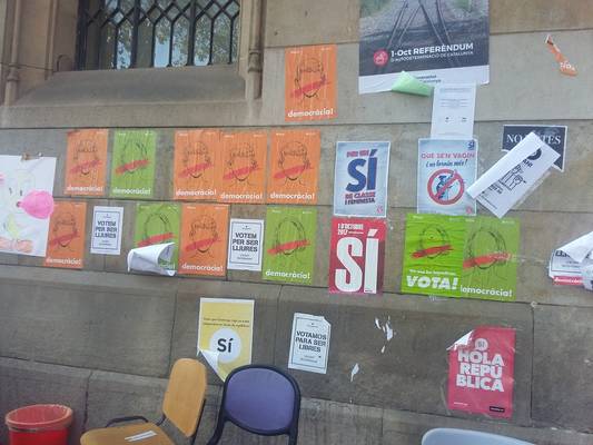 Kot že leta še naprej vihrajo katalonske zastave po oknih, zdaj po balkonih, ki so prav tako okrašeni v katalonskih barvah, ropotajo tudi lonci in kuhalnice. Pred univerzo, denimo, je med študenti, ki tiskajo za mimoidoče letake in duhovite plakate, veliko prazničnosti in republikanske navdihnjenosti. Poleg tega so bili Barcelončani sinoči povabljeni še k zadnjemu velikemu ljudskemu zborovanju pred nedeljskim ljudskim glasovanjem s političnim vodstvom v prvi vrsti: katalonskim predsednikom Carlesom Puigdemontom in podpredsednikom Oriolom Junquerasom.