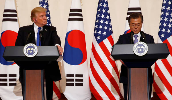 Ameriški predsednik je bil nenavadno dvoumen. Najprej je ponovil, da je treba zdaj »delovati z občutkom nujnosti in zelo odločno« in da so ZDA pripravljene uporabiti vse vojaške zmogljivosti, če bo treba, nato pa je kljub vsemu pozval Pjongjang, da »sklenejo posel« in se tako izognejo najhujšemu. »Resnično sem prepričan, da je za Severno Korejo smiselno, da sede za [pogajalsko] mizo in sklene posel, ki bi bil dober tako za njen narod kot za vse ljudi tega sveta,« je dejal Trump na skupni tiskovni konferenci, ki sta jo z Munom imela neposredno po koncu uradnih ¬pogovorov.