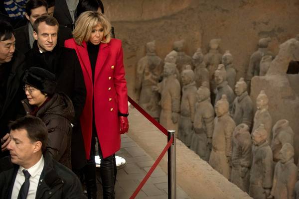Emmanuel in Brigitte Macron sta si v Xi'anu ogledala znamenite vojščake it terakote. Foto: Mark Schiefelbein/AFP