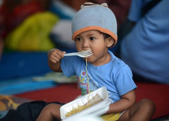 Otrok v evakuacijskem centru; do danes je območje pred vulkanom zapustilo že skoraj 50.000 ljudi. Foto: SONNY TUMBELAKA/AFP