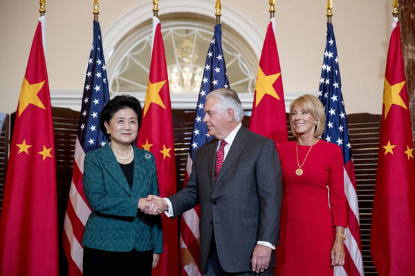 Državni sekretar Rex Tillerson in sekretarka za izobraževanje Betsy DeVos (desno) sta se v Pekingu srečala s podpredsednico vlade Liu Yandon. Foto: AP