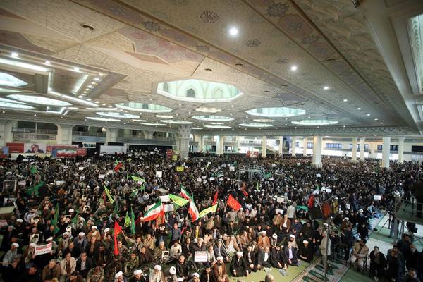 Množice po poročanju francoske tiskovne agencije AFP vihtijo iranske zastave in nosijo slike iranskega vrhovnega poglavarja ajatole Alija Hameneja. »Kri v naših žilah ti je na voljo, o veliki vodja,« tudi vzklikajo.