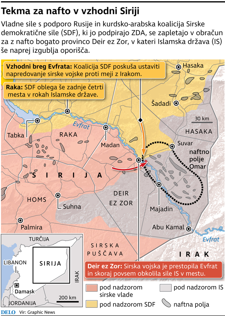 Na vzhodu Sirije, v provinci Deir ez Zor, bogati z nafto, te dni potekata dve ločeni ofenzivi proti silam Islamske države (IS). Na zahodnem bregu reke Evfrat proti meji z Irakom prodirajo enote sirskih vladnih sil, ki jim ob strani stoji Rusija, na vzhodnem bregu pa položaje skrajne sunitske milice napadajo pripadniki kurdsko-arabskega zavezništva Sirske demokratične sile (SDF) ob podpori ZDA.