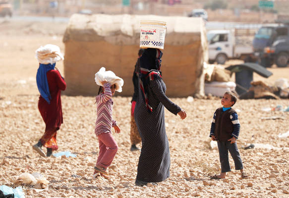 Ženska in otroci nosijo hrano in vodo, nastanjeni v begunskem taborišču v Siriji. Foto: Erik De Castro/REUTERS