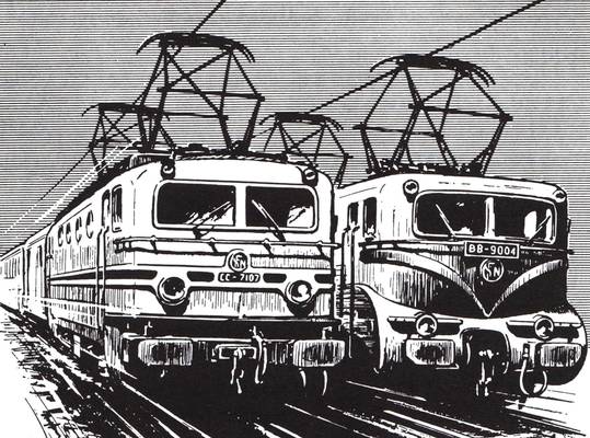 Francoski električni lokomotivi − šestosna CC 7107 in štiriosna BB 9004 − sta leta 1955 dokazali, da sta glede vedenja na tiru in moči enakopravni in da so Francozi trenutno vodilna železniška velesila. Seveda so se francoske železnice SNCF potem rade malo postavljale s tole ilustracijo ... Foto: Arhiv Železniškega muzeja SŽ